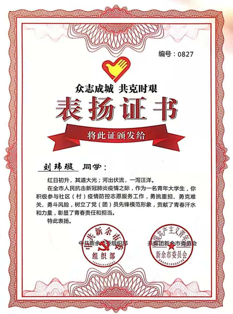 居住地位于江西省新余市,在本次疫情期间该市感染率仅次于湖北,在全市人民抗击新冠肺炎疫情之际,作为一名青年老员工,积极参与社区疫情防控志愿服务工作,多次与小区党员志愿者和社区工作者一起为社区值守,保障社区居民在疫情期间的生活需求,与疫情奋战,贡献了青春汗水和力量,并获得社区发放的奖状。