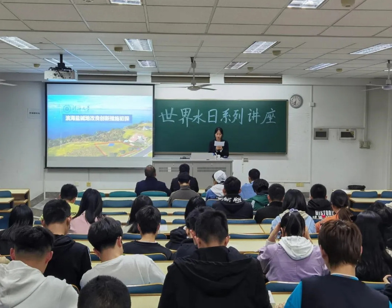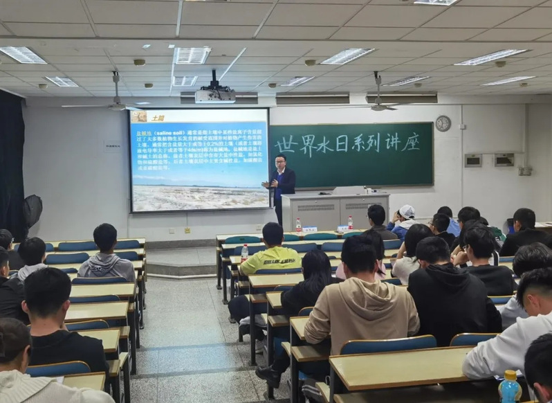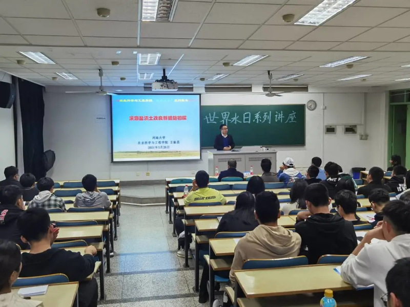 王振昌副教授的介绍热情洋溢,语言幽默诙谐,在很好带动起大家兴趣的同时,也使大家对学术知识方面有了更深一步的了解。在讲座中王教授形象地从“水、土、木、火、金”五个方面展开。在“水”篇中,王教授简要介绍了自己与水结缘的经历,并与大家分享了自己在国内外开展研究的珍贵图片,大家无不感到新鲜惊奇;在“土”篇里,王教授发挥所长,直击本次讲座主题,专业地向大家介绍了盐碱地的分布、面积、分类等基本信息,着重讲解了改良盐碱地的方法,让大家了解开发利用盐碱地的重大意义的同时,提高了大家在节约用水方面的意识;在“木”篇中,王教授分享了多种在盐碱地种植树木和农作物的新型方法,例如隔离层处理盐分、“隔离+排水”秸秆条带、盐碱滩涂养殖废水稻田净化与再利用技术等效果显著、效率高效的种植改良技术,令大家耳目一新,受益匪浅;在最后的“火”和“金”篇中,王教授表达了对每位热情追求学术学习学子的认可和期待,鼓励大家要对自己专业持有十足的信心,并在结尾以“千淘万漉虽辛苦,吹尽狂沙始到金”与大家共勉。