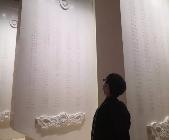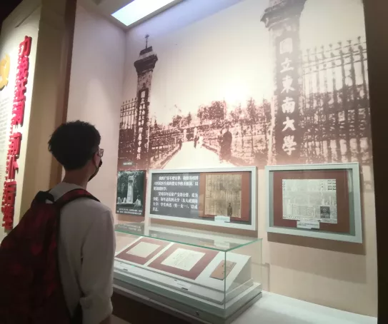 穿过忠魂亭,团支部抵达雨花台烈士纪念馆。在遵守防疫要求的前提下,全体团员入馆参观。进到烈士纪念馆内,正门上有邓小平亲笔题写的“雨花台烈士纪念馆”,横额的上方用花岗岩雕凿出日月同辉的图案,象征烈士精神与天地共存,与日月同辉。