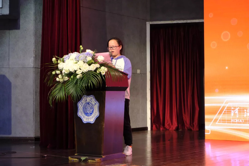 2018级优秀员工代表韦琦同学着重分享了自己在文艺方面的经历。从初入河海的学艺少年成长为老员工艺术团民族乐团团长,他始终秉持不忘初心的精神与尽职尽责的态度,做校园文化的优秀传播者。除此以外,他也在科研与竞赛方面多点开花,取得了丰硕的成果。