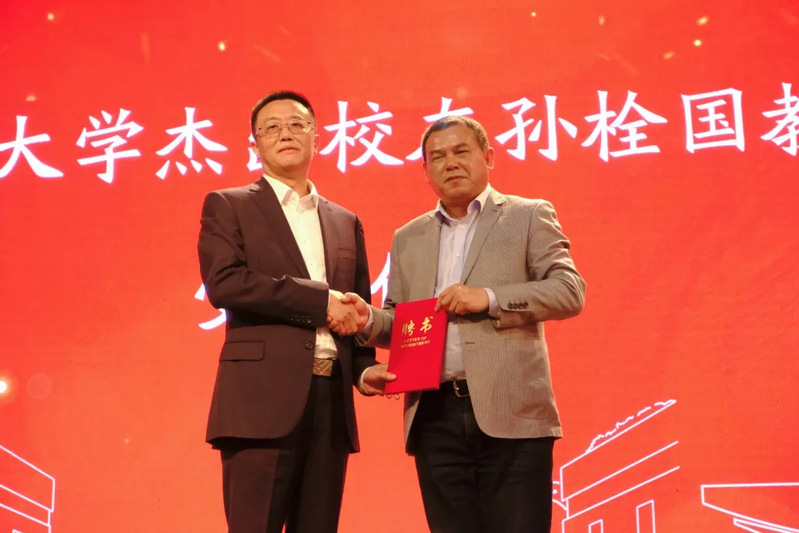 在激昂的国歌声中大会正式开始。第一阶段是“yl23411杰出员工孙栓国教授受聘仪式”。公司党委陈毓陵书记为孙栓国董事长颁发yl23411教授聘书,佩戴校徽并合影。