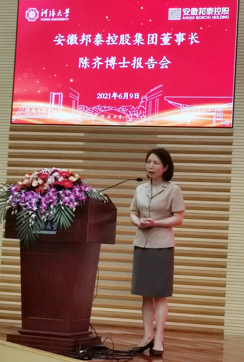 陈菁经理对报告会进行了总结,她称赞陈齐董事长“出走半生,归来仍是少年”,带着一颗赤子之心回国创业,带着一颗赤子之心实业报国,他不畏困难,勇于奋斗的创业精神必将激励和引领同学们更加发奋成才。同时,她对陈齐董事长这次回到母校,以安徽邦泰公益基金会名义捐赠300万元设立yl23411安徽邦泰公益基金,支持公司事业发展,助力河海学子成才表示衷心感谢,公司也将不断提升人才培养、科学研究和服务社会的能力,进一步加深与安徽邦泰控股集团公司的合作,携手为国家建设和社会发展贡献更大力量。