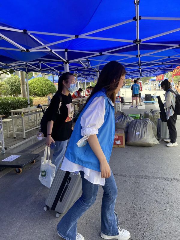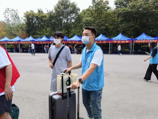 南门志愿者为新生搬运行李,向新同学们介绍公司。