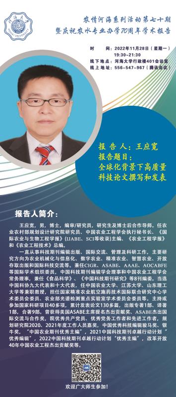 农情河海系列活动第七十期 暨庆祝农水专业办学 70 周年学术报告