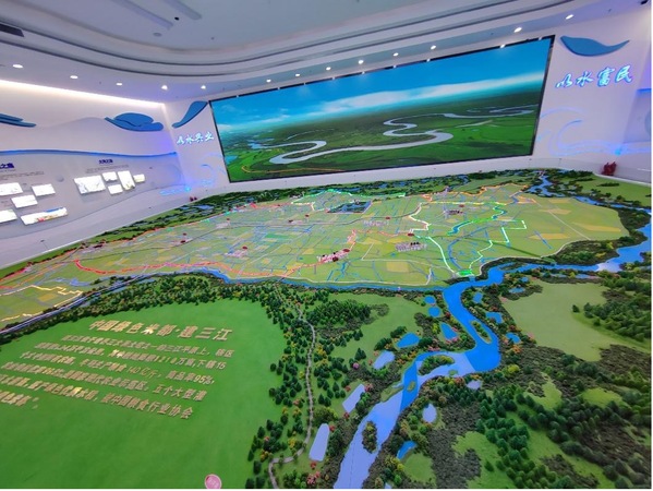 在北大荒智慧农业农机中心,实践团队师生观看了建三江宣传片。建三江位于世界三大黑土地带之一的三江平原上,辖区总面积1.24万平方公里,其中耕地面积1210万亩,下辖15个大中型国有农场,年可生产粮食140亿斤,农业机械化率99.8%,是国家现代农业示范区。建三江之所以成为中华粮仓,除了肥沃平整的黑土地,更离不开青龙山、八五九、勤得利三大灌区的滋养。三大灌区引江水灌溉,使得水稻产量高品质优,被中国粮食行业协会授予“中国绿色米都”。其中青龙山灌区,灌区控制面积990.79万亩,是继都江堰灌区、淠史杭灌区和河套灌区的第四大灌区,中华人民共和国成立后第二大灌区,黑龙江省最大灌区。通过采取灌排结合和“三水联合调度使用”,推广应用水稻节水控制灌溉技术,使灌区具备了高效节水的扎实基础,为建设现代农业领域航母发挥了重要的水利支撑保障作用!